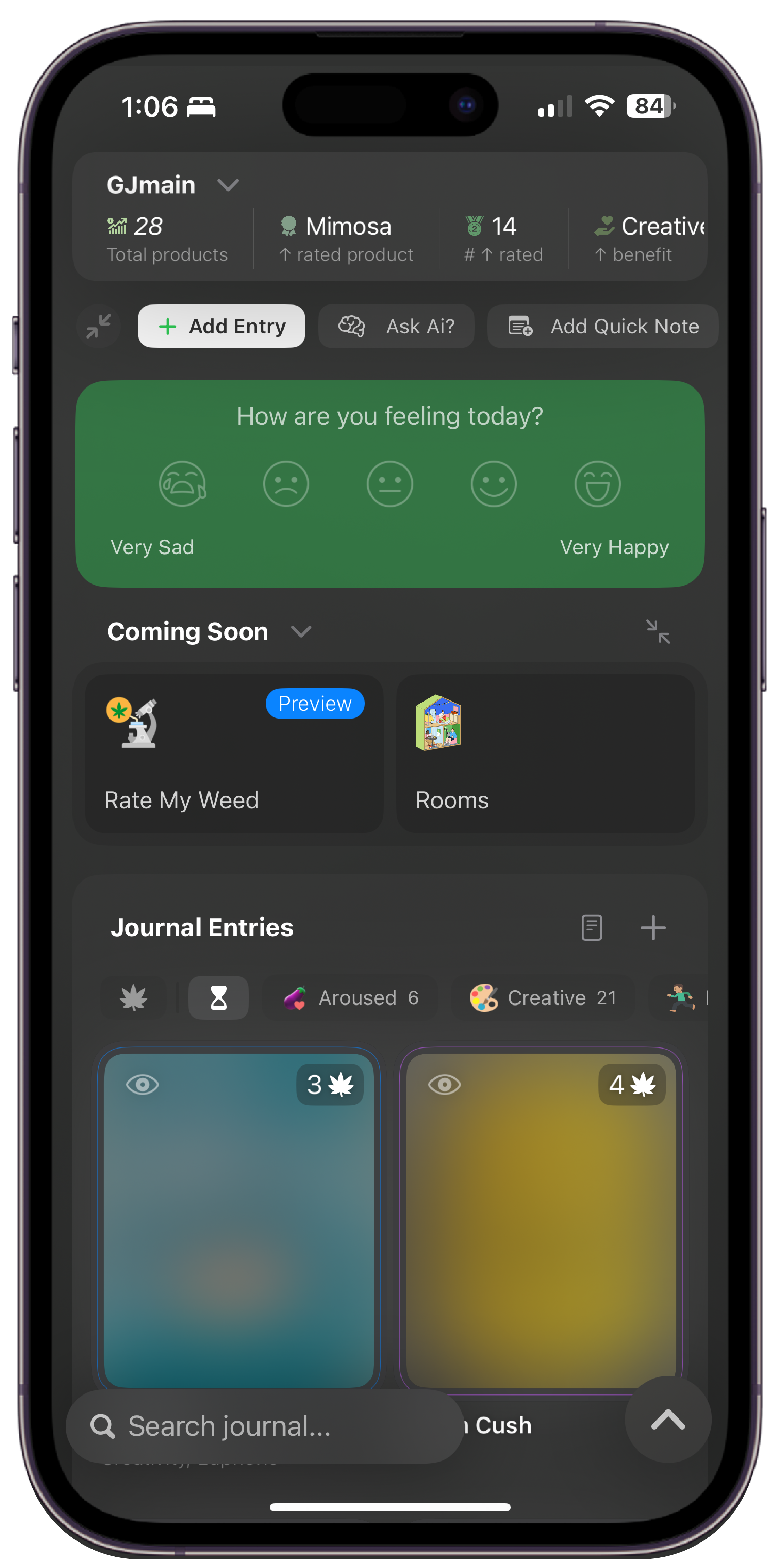 Quickly document your cannabis experiences with our Quick Notes feature. Whether you’re savoring a new strain, noting the effects of an edible, or capturing an immediate reaction, Quick Notes allows you to log your insights instantly. With a user-friendly interface, you can swiftly add a note, ensuring no detail is lost. Quick Notes seamlessly integrates with your full journal providing a comprehensive record of your cannabis journey. Stay organized and informed with quick and easy access to all your observations.