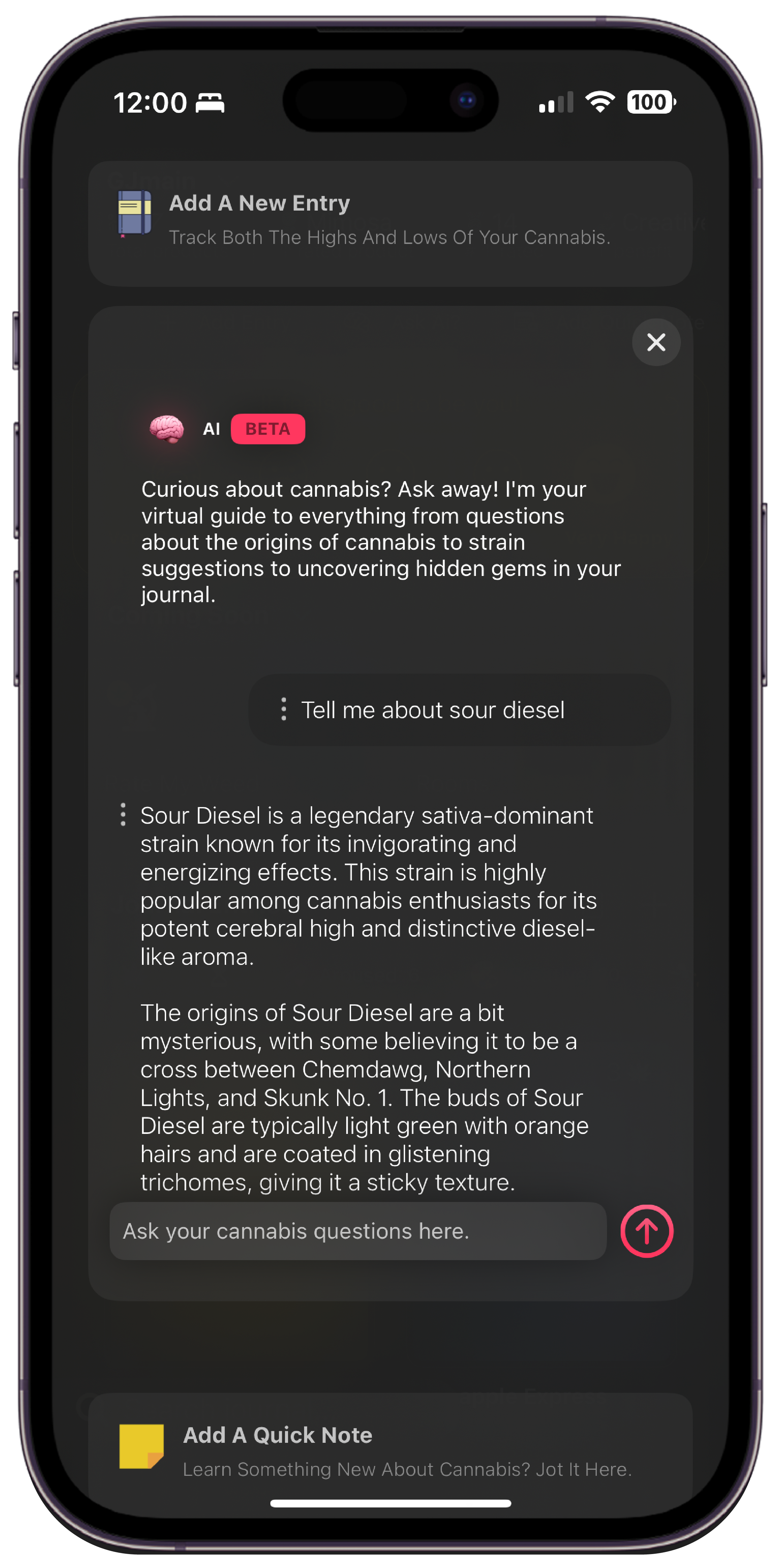 Our AI assistant is here to elevate your cannabis experience. Whether you're a seasoned connoisseur or a curious newcomer, our intelligent bot offers personalized advice, product recommendations, and answers to all your cannabis-related questions. Seamlessly integrating advanced technology with a deep understanding of cannabis, it provides insights tailored to your unique preferences and needs. Engage in enlightening conversations, explore new strains, and enhance your knowledge with our AI assistant, your ultimate guide in the world of cannabis.